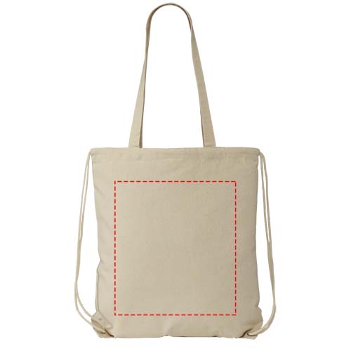 Multifunktionaler Baumwolltsportbeutel mit langen Griffen und Kordelzug, der als Tasche oder Rucksack getragen werden kann. Großes Hauptfach mit Kordelzugverschluss. Mit zwei herunterklappbaren Griffen von 31 cm Länge. Kapazität: 1,5 l, für bis zu 5 kg Gewicht.