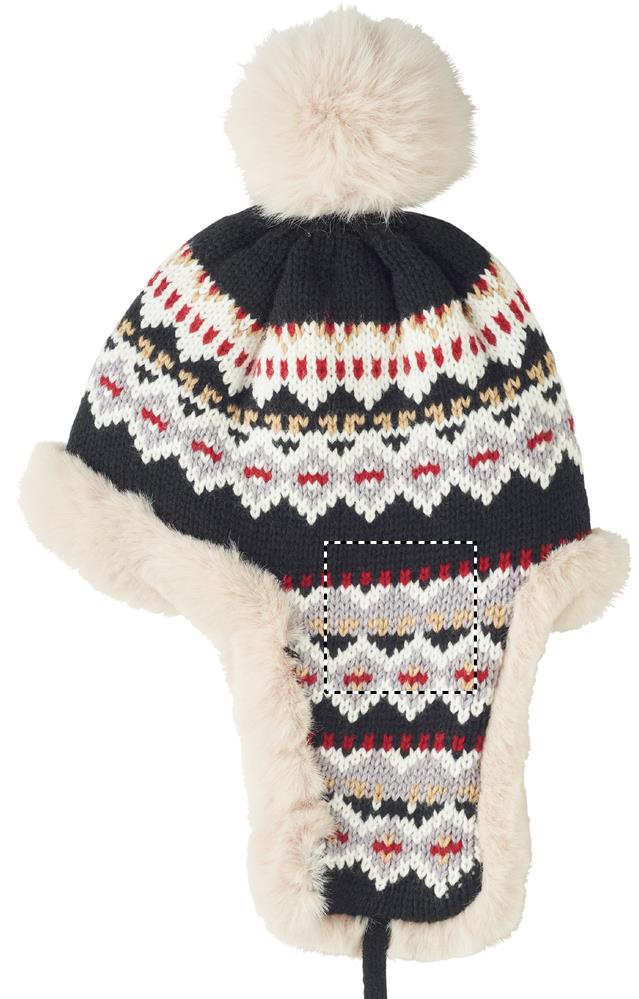 Gestrickte Mütze mit Ohrenklappen und Bommel aus Acrylfaser mit Polyester- und Fleece-Futter. Mit Label zur Werbeanbringung. Einheitsgröße.