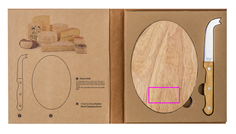 Käseset inklusive rundem Holzbrett und Käsemesser aus Edelstahl, welches auch zum Servieren verwendet werden kann. Ihre Werbung wird auf das Brett graviert.