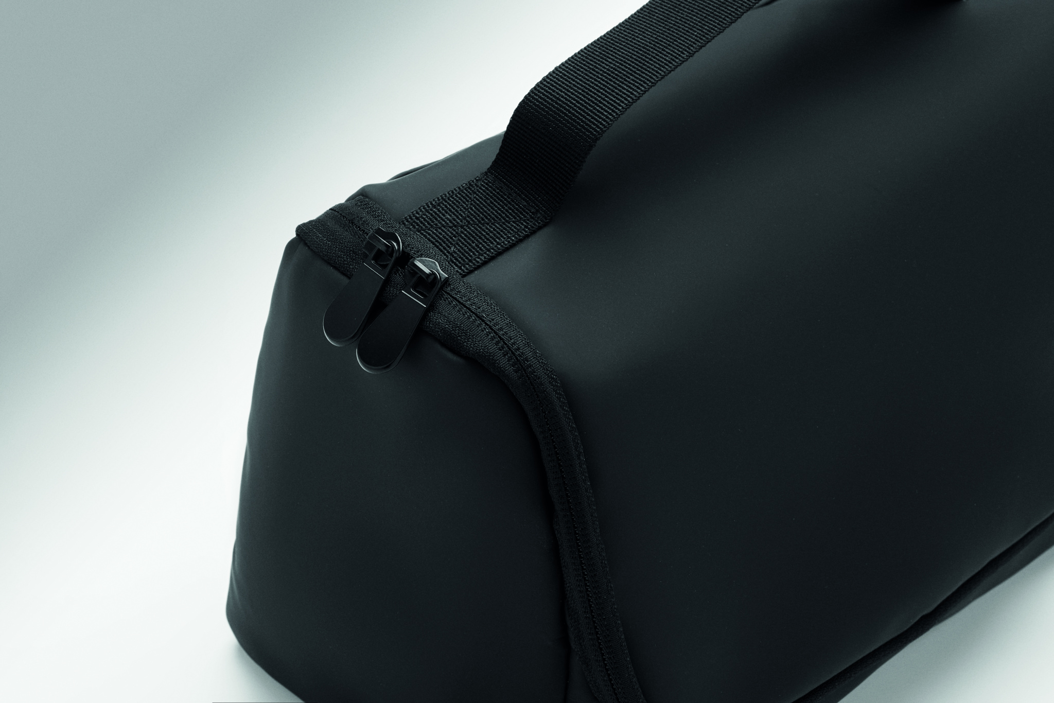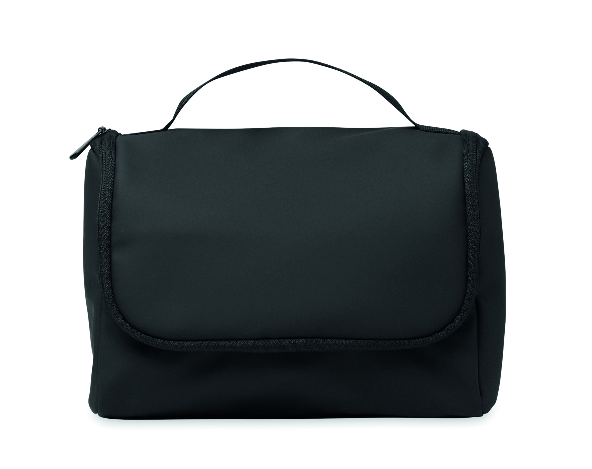 Kosmetiktasche aus weichem PU. Großes Hauptfach, inneres Netzfach mit Reißverschluss und weiteres Netzfach. Aufhänger und 210D RPET-Futter.