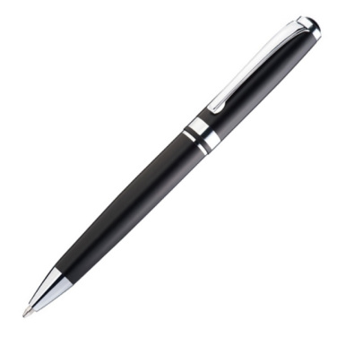 Hochwertiger Metallkugelschreiber in mattem Schwarz mit glänzenden Silberapplikationen und edlem Etui. Ihre Werbung gravieren wir unterhalb des Clips.