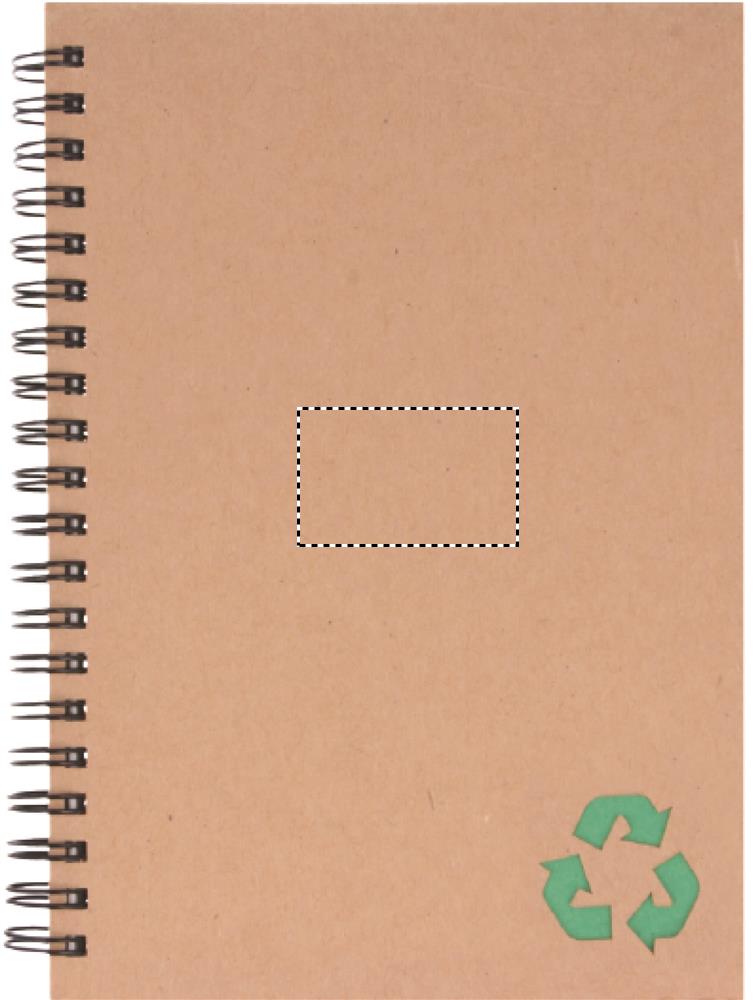 Notizbuch mit recyceltem Kartoneinband. Doppeldraht. 140 linierte Seiten aus Mineralpapier (70 Blatt). Mineralisches Papier wird aus Kalziumkarbonat und HDPE (Polyethylenharz) hergestellt. HDPE wird als Bindemittel verwendet. Es ist wasserdicht und Beständig gegen Fett.