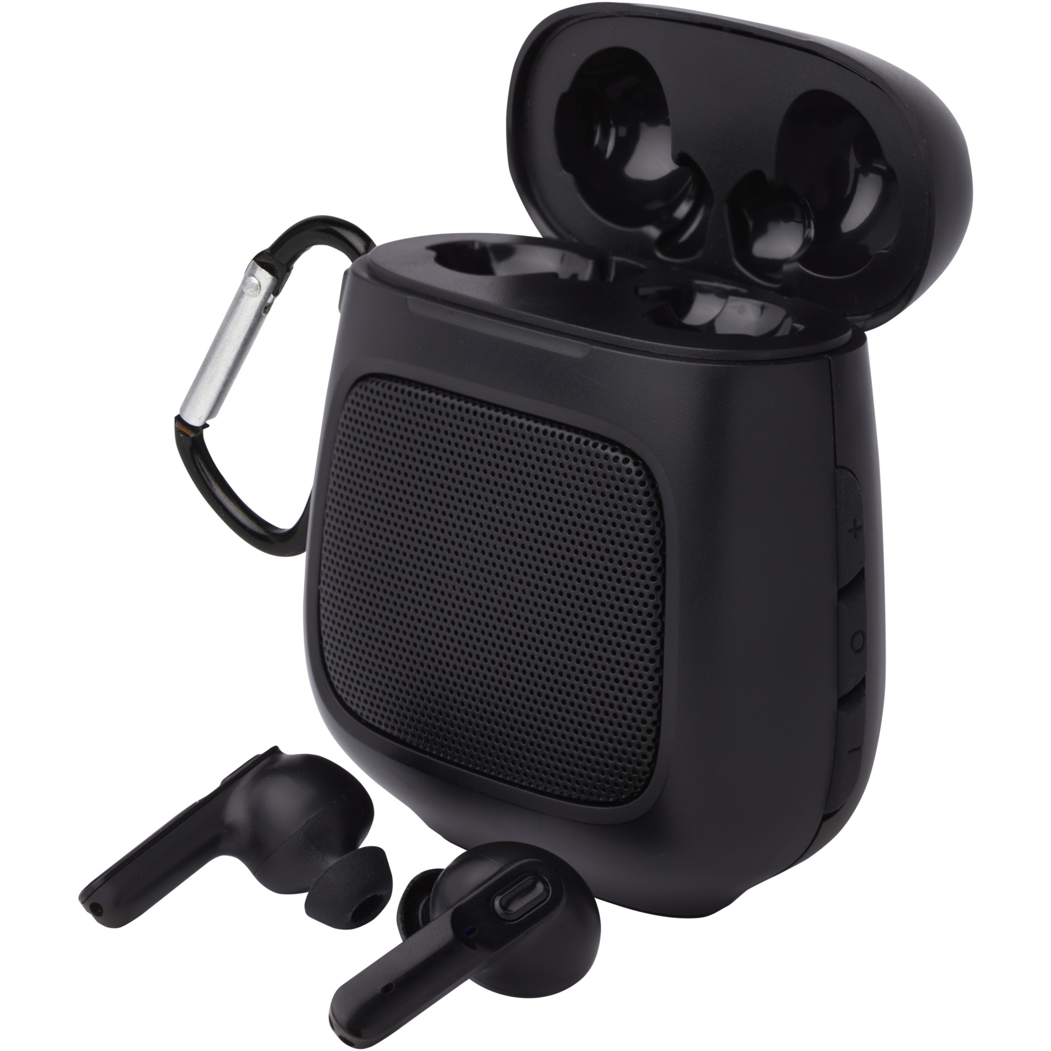 Der Remix kombiniert True Wireless Ohrhörer mit einem Bluetooth®-Lautsprecher. Sobald die Ohrhörer aus dem Etui genommen wurden, werden sie eingeschaltet und automatisch miteinander synchronisiert. Die Tragetasche dient auch als Ladestation für die Ohrhörer und als Bluetooth®-Lautsprecher. Das Etui kann die Ohrhörer mit einer einzigen Ladung viermal von 0 auf 100 % aufladen, und die Ohrhörer kann man mindestens 4 Stunden lang verwenden, bevor sie aufgeladen werden müssen. Das ergonomische Design der Ohrhörer sorgt dafür, dass sie auch unterwegs an Ort und Stelle bleiben. Die Ohrhörer und der Lautsprecher sind in 2 Stunden von 0 auf 100 % aufgeladen. Sowohl die Ohrhörer als auch der Lautsprecher verfügen über ein integriertes Mikrofon und eine Musiksteuerung, mit der Sie Anrufe entgegennehmen oder tätigen können. Bluetooth®-Bereich von 10 m (33 Fuß). Mittlere und große Ohrstöpsel sind im Lieferumfang enthalten. Verpackung in einer Premium-Geschenkbox.