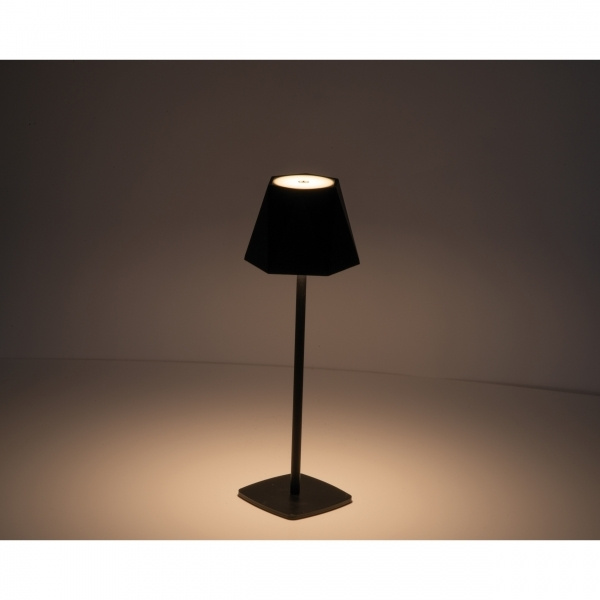 Tischleuchte mit Edelstahlfuß und Kunststoffschirm (PP). Die Leuchte verfügt über einen 1.800 mAh Li-Ionen-Akku (3,7 V), 28 LEDs (130 Lumen, 2,5 W), die über einen Touch-Sensor mit stufenloser Dimmfunktion zwischen 3000 K (warmes Licht) und 6000 K (kaltes Licht) eingestellt werden können. Ein ein Meter langes USB-C-Ladekabel ist im Lieferumfang enthalten. Die Leuchtdauer beträgt bei voller Ladung ca. 5 Stunden. Ihr Logo wird mittels Lasergravur auf den Fuß aufgebracht. Die Leuchte wird unmontiert geliefert.