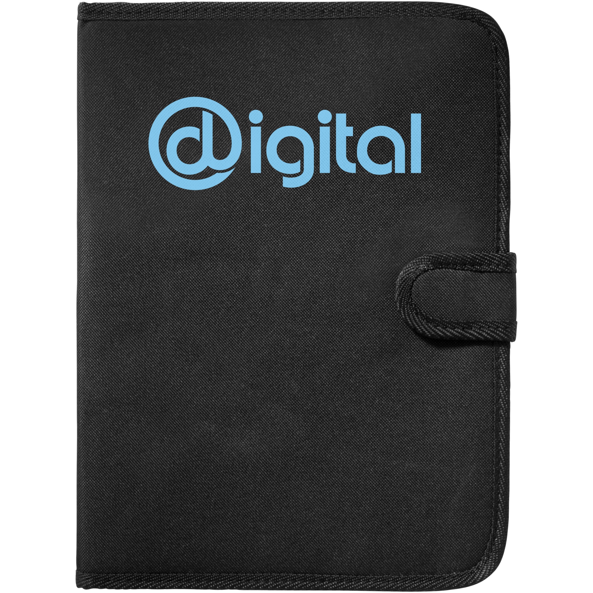 Mappe mit Klettverschluss, Stiftschlaufe, Dokumentenfach und Notizblock mit 20 Blatt, liniert.