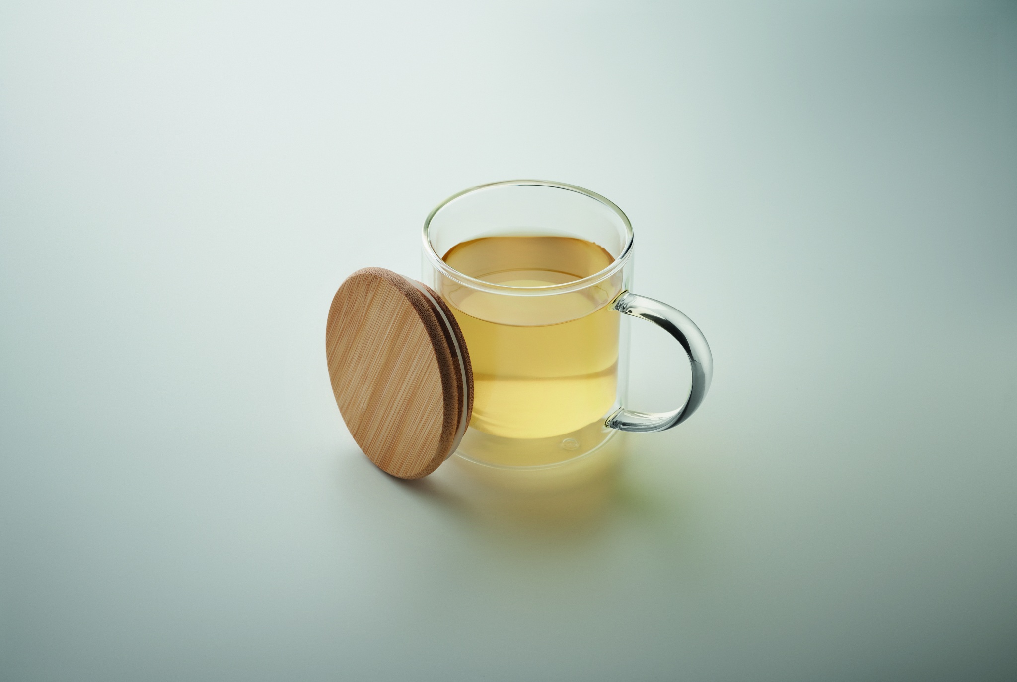 Double wall borosilicate glass mug with bamboo lid and colours handles. Capacity: 300 ml.