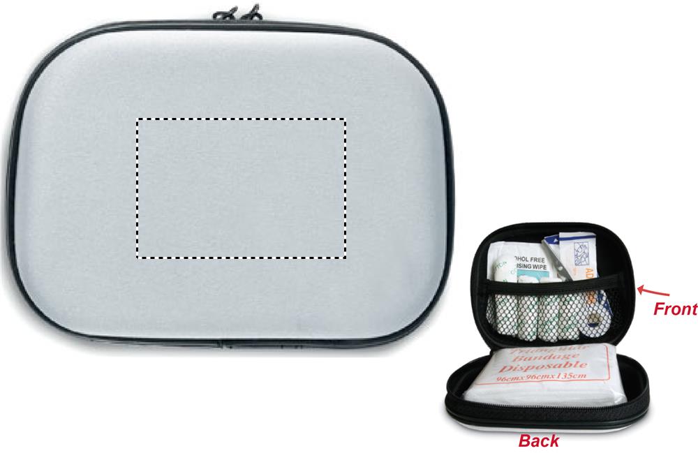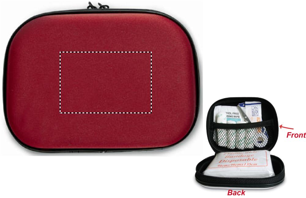 First aid kit in EVA material. Includes 1 pair of scissors, 3 pad bandages, 1 triangular bandage, 1 roll of cotton, 2 cleaning tissues, 5 adhesive bandages, 1 roll of tape and 6 cotton buds.