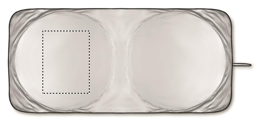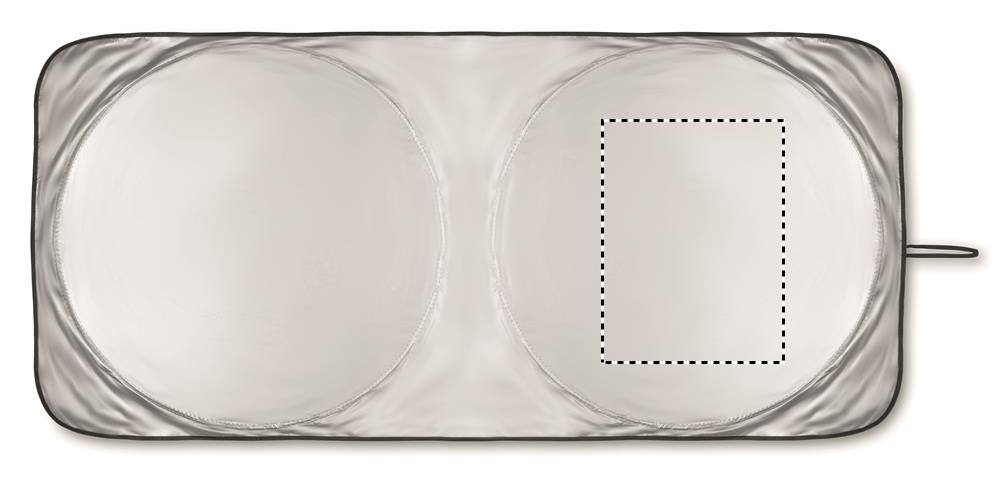 Foldable sun car visor in 170T polyester including pouch.