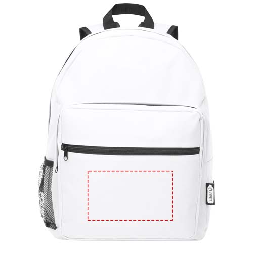 Durable backpack made of 100% GRS certified recycled, post-consumer polyester which contributes to the reduction of plastic waste. Features adjustable shoulder straps, 2 zipper compartments, and a front zipper pocket. Approximately 15 bottles are recycled to make this bag.