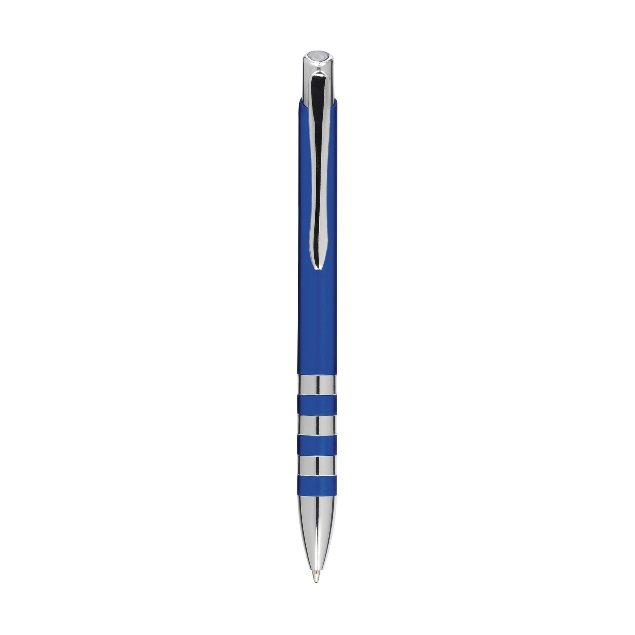 Blue ink ballpoint pen with metallic look barrel, metal clip, push button and shiny barrel rings.