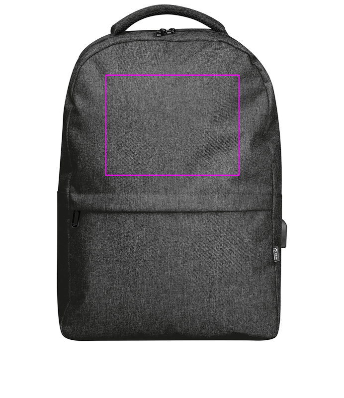 rPET backpack with USB port, padded straps, laptop compartment, front compartment and anti-theft compartment. We print your logo on the front compartment.