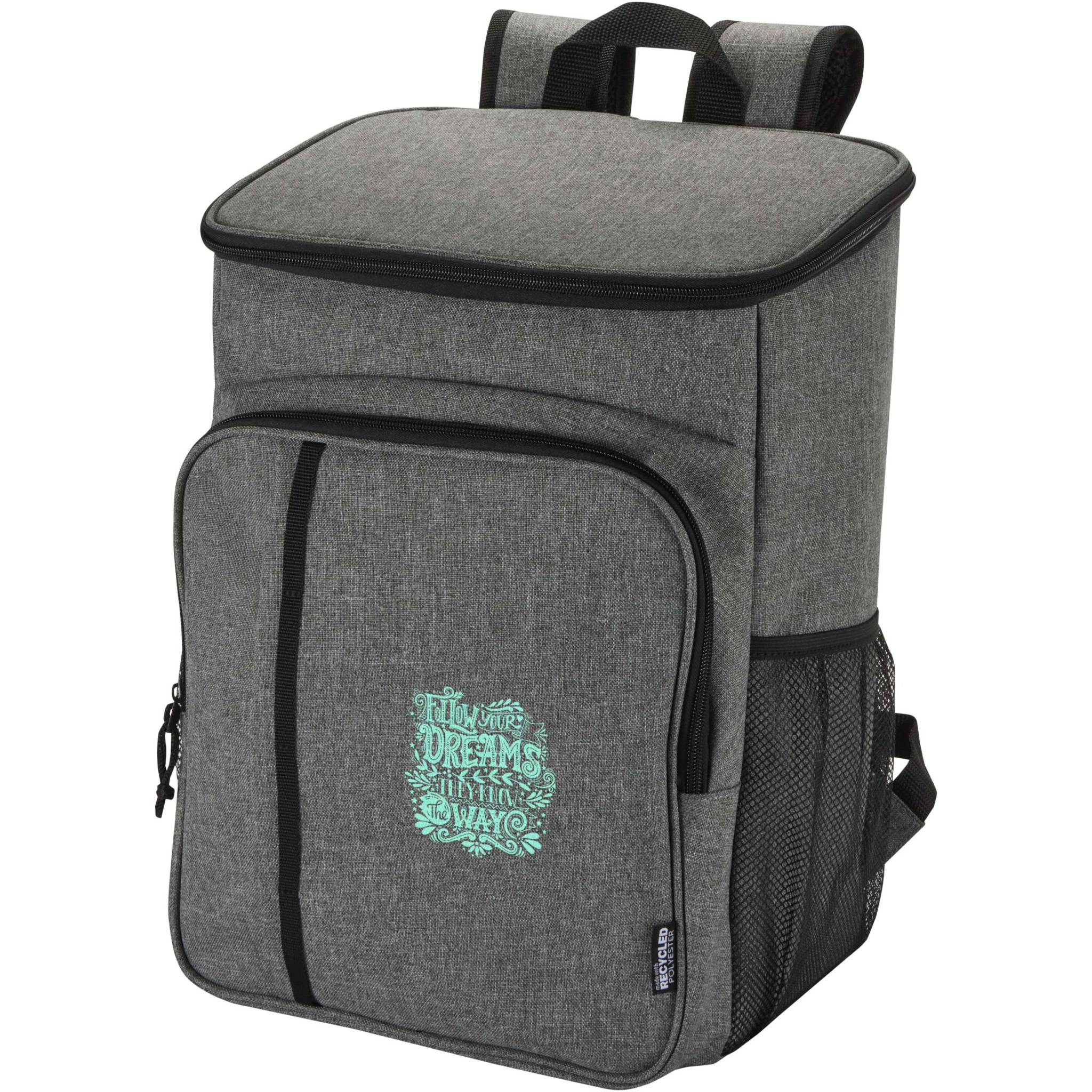 The Tundra picnic cooler backpack is made from GRS certified recycled materials and comes with a reusable two-person cutlery set made from food-grade plastic. Its leak-proof main compartment, insulated with high-density foam and a heat-sealed PEVA lining, keeps food and drinks chilled for hours. For added convenience, it includes two side mesh pockets, a zipped front pocket with tableware (two knives, two forks, two cups, and two plates), and an extra zipped pocket on top. Padded adjustable shoulder straps and a sturdy webbing handle make it comfortable to carry, making this backpack an ideal companion for picnics, outdoor dining, camping, or beach trips. Volume capacity: 20 litres.