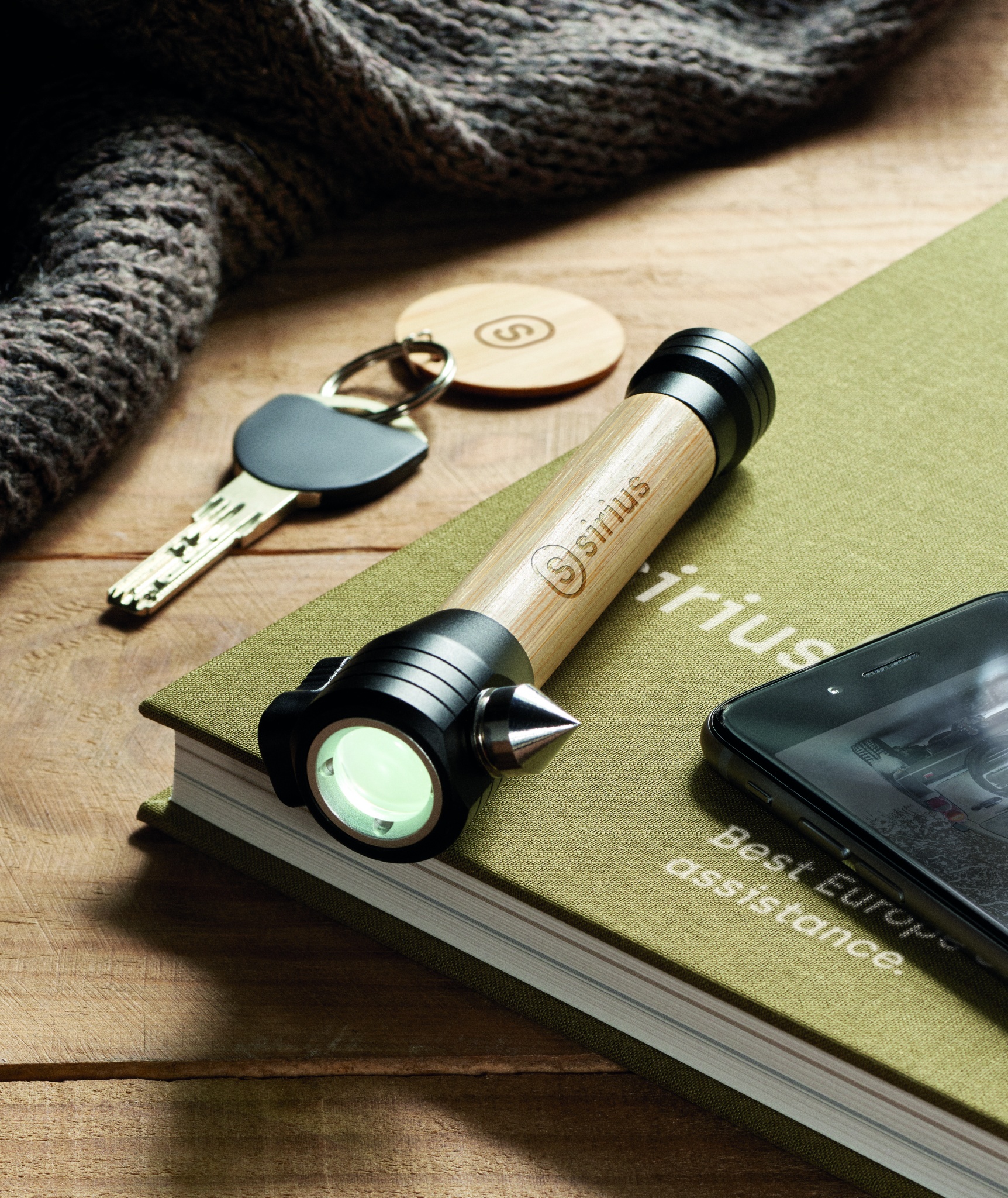 Logo trade meened foto: 3-ühes bambusest taskulamp koos avariivasara ja turvavöölõikuriga