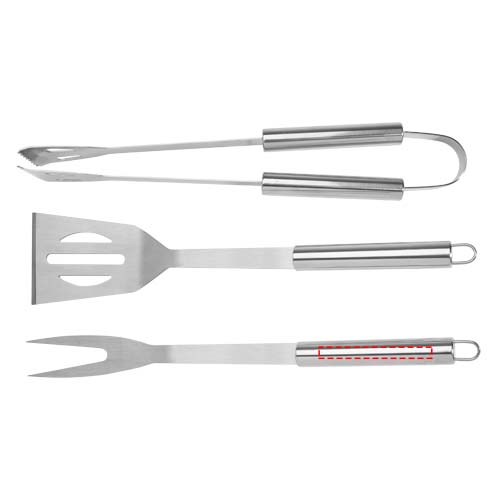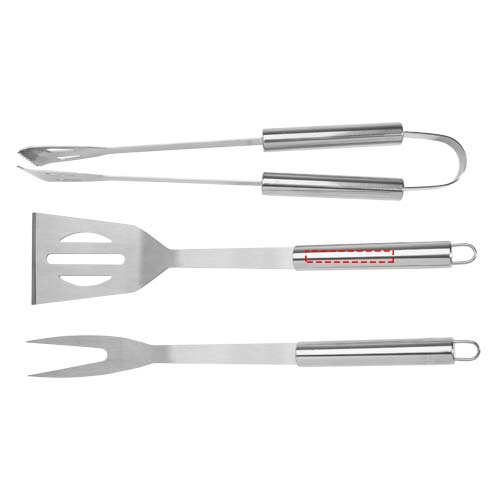 3-osaline grillikomplekt labida (34,8 x 7,5 cm), kahvli (35,4 x 3,35 cm) ja tangiga (35 x 6,8 x 4 cm). Kõik tarvikud tarnitakse kerges ümbrises, et oleks lihtne kaasas kanda ja hoiustada. Ideaalne grillitarvik aeda või sõprade ja perega õues grillimiseks kaasa võtmiseks.