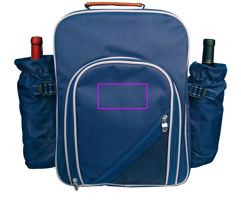 Lõõgastu looduses! Nautige hubast piknikku neljale selle kvaliteetse polüestrist piknikuseljakotiga. See sisaldab avarat jahutuskambrit tagaosas toidu värskena hoidmiseks, kahte pudeli jahutuskambrit külgedel, palju varustust esiosas, nagu plastnõud ja klaasid, söögiriistad, väike plastalus, korgitser, sool ja pipar shaker ja nuga. Esisahtel pakub täiendavat hoiuruumi. Me paneme teie logo esilahtrisse.