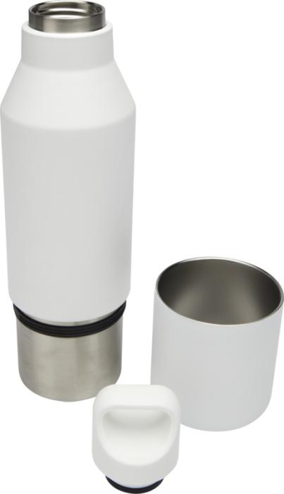RCS sertifikaadiga roostevabast terasest kahekordse seinaga vasest isoleeritud pudel koos eemaldatava tassiga. See mitmeotstarbeline pudel sobib seljakoti küljetaskusse ja sellel on mugav kandesang, mis on integreeritud korgiga. Vastupidav jõukate välisküljel. Hoiab joogid kuumana 12 tundi või külmana 24 tundi. Esitatakse taaskasutatud papist kinkekarbis. Pudeli maht: 600 ml. Tassi mahutavus: 300 ml.