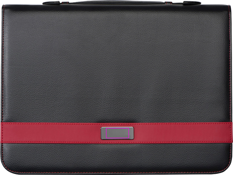 A4-formaadis mapp parimast tugevdatud nahast (nahkkiudkangast), sees mitmesugused kummist aasad ja taskud, rõngasköitja, kirjutusplokk (60 lk), tahvelarvuti/nutitelefoni hoidik, mobiiltelefoni tasku, kandesanga ja tõmblukuga. Teie logo graveeritakse metallplaadile.