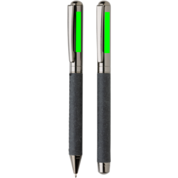 See kaunis pliiatsikomplekt on valmistatud taaskasutatud nahast. Komplektil on elegantne gunmetal värviline disain, stiilne ja ideaalne oma märkmete stiilseks kirjutamiseks. See sisaldab kuulipalli ja rullpalli. Iga pliiats sisaldab sinist dokumentaaltinti. Pliiatsi kirjutuspikkus on 1200 meetrit ja rullpalli 400 meetrit. Pliiatsikomplekt on taaskasutatud nahast kotis ja kinkekarbis, millel on taaskasutatud nahast muster.