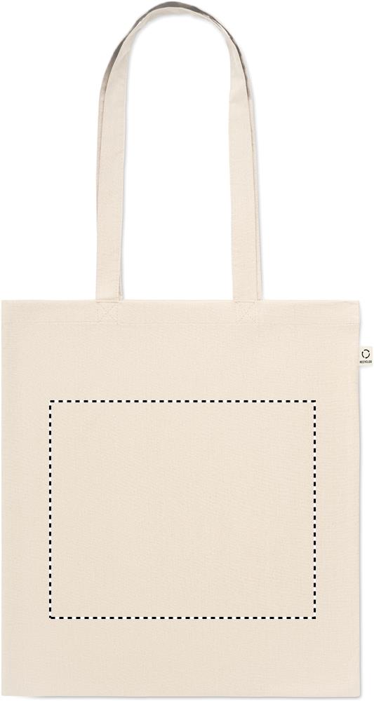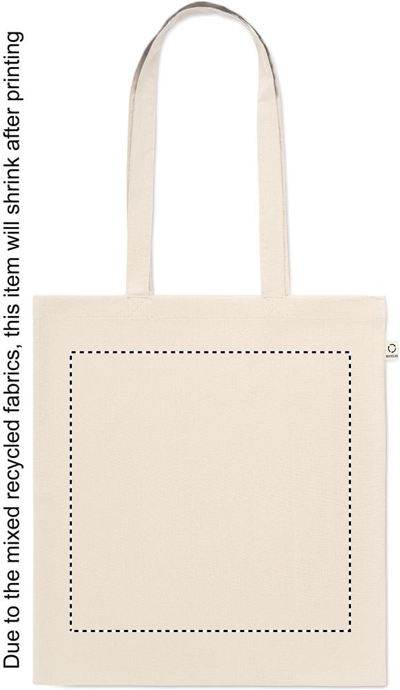 Tarbimiseelsest taaskasutatud puuvillasest ostukott (70% taaskasutatud puuvill ja 30% RPET) pikkade sangadega. 140 gr/m².