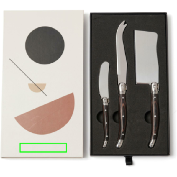 Eksklusiivne roostevabast terasest juustunugade komplekt, mis koosneb kahest juustunoast ja musta pakka puidust käepidemega võinoast. Pakitud eksklusiivsesse kinkekarpi.