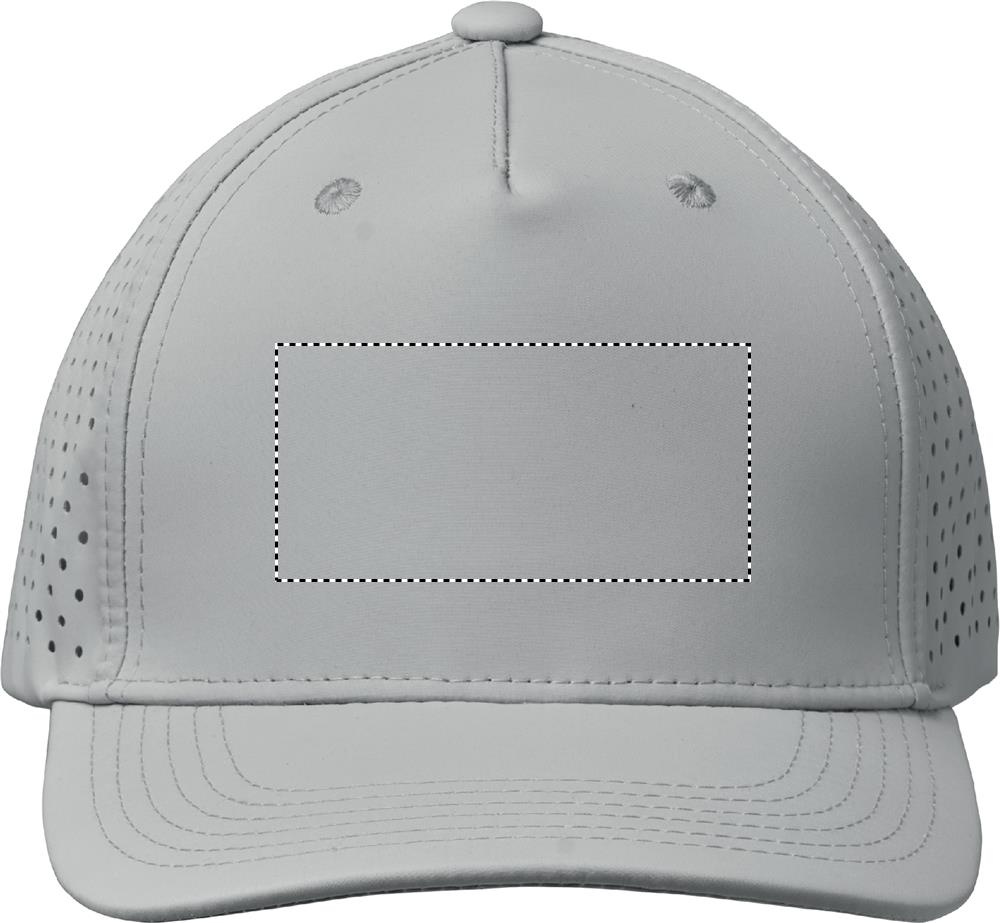 5 paneelista valmistettu polyesterikorkki, jossa on säädettävä koukku ja silmukkasuljin sekä laserrei'itetyt reiät, joissa on 2 ommeltua silmukkaa yhteensopivalla värillä. Tuote on nopeasti kuivuva, hikeä ja vettä hylkivä. 200 g/m²