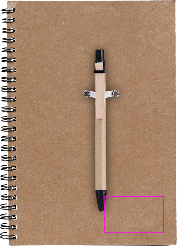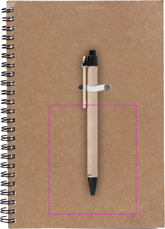 Kierrätyspahvista ja -paperista valmistettu A5-kokoinen kirjoitusalusta, jossa 120 viirallista sivua ja sininen mustekuulikakynä kierrätyspahvista. Painamme logosi kanteen.