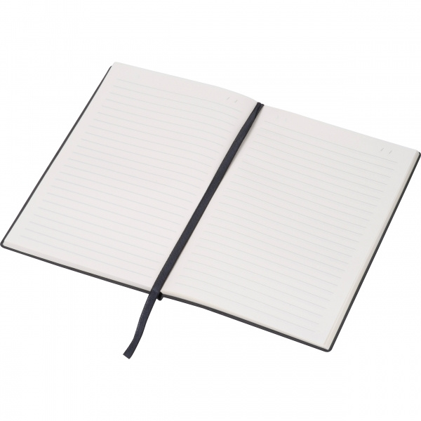 A5-kokoinen muistikirja, jossa on joustavat pehmeät PU-kannet, kirjanmerkki ja 192 viivoitettua sivua kierrätyspaperista. Logosi on painettu kanteen punotun alueen alapuolelle.