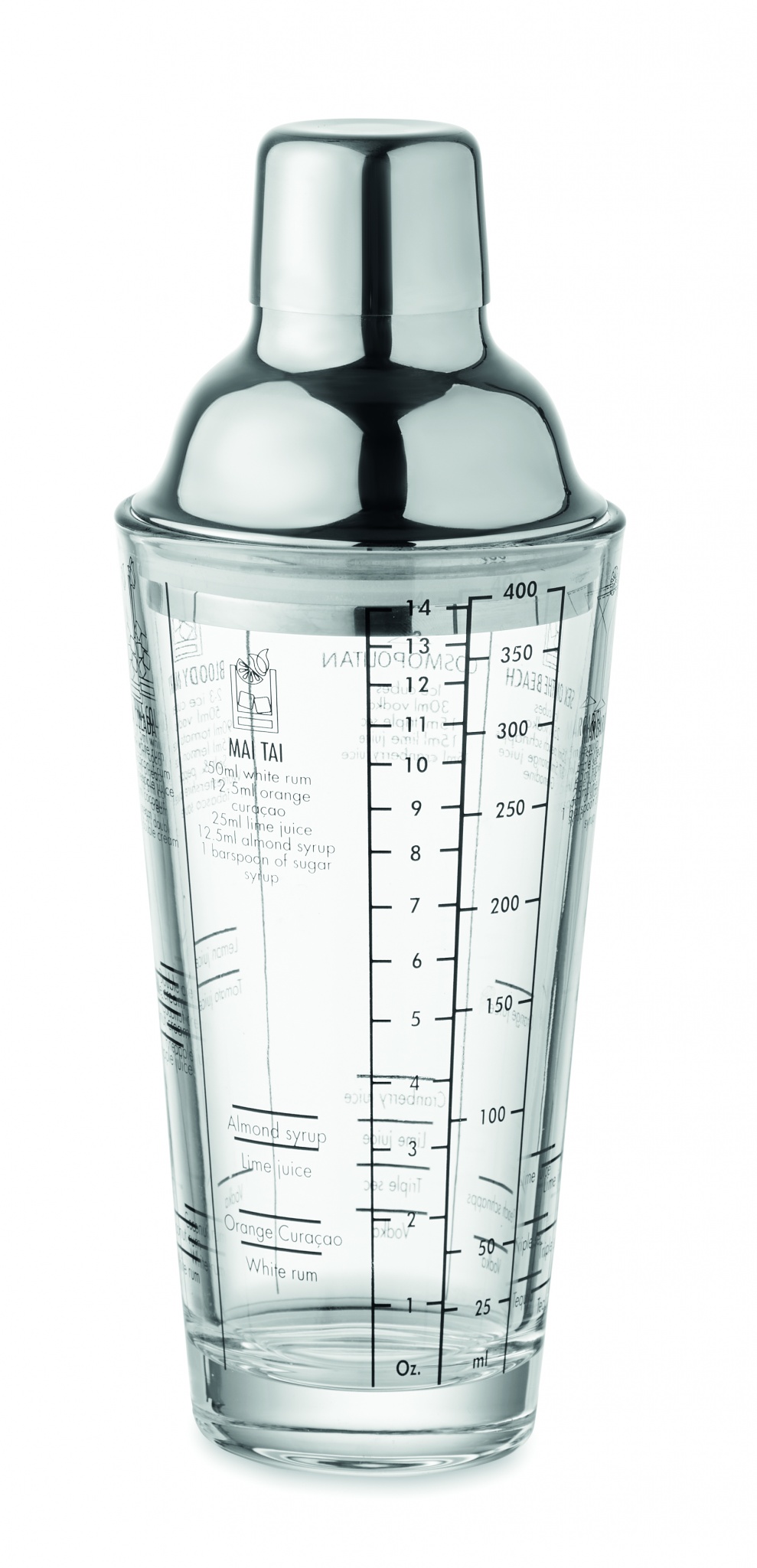 Lasinen cocktail-shaker, jossa on ruostumattomasta teräksestä valmistettu kansi ja lasiin painetut cocktailreseptit ja mittatiedot. Tilavuus: 400 ml.