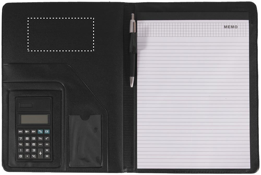 Keinonahkainen A4 kansio, sisältää aurinkoenergialla toimivan laskimen, kuulakärkikynän sinisellä musteella ja 20 sivun muistilehtiön.