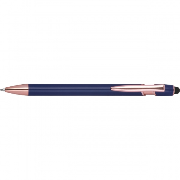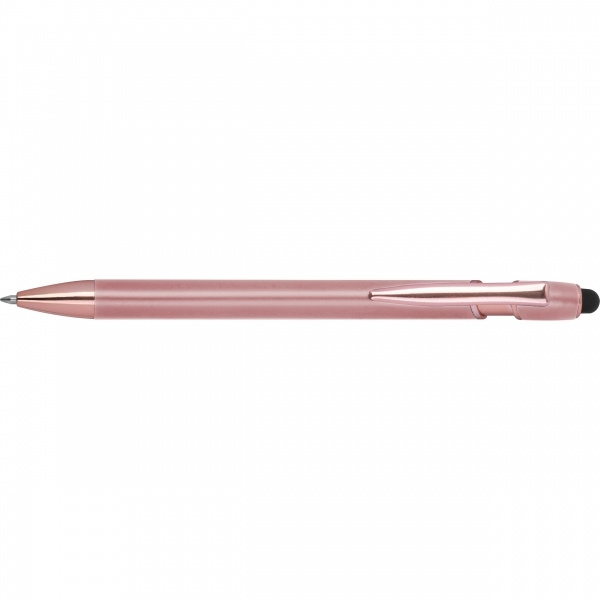 Kierrätetystä alumiinista valmistettu puoligeelikynä, jossa on kosketuskynä ja sinisellä kirjoitettava suurikapasiteettinen täyttöpakkaus (1 mm:n kärki). Logosi on kaiverrettu runkoon laserkaiverruksella.