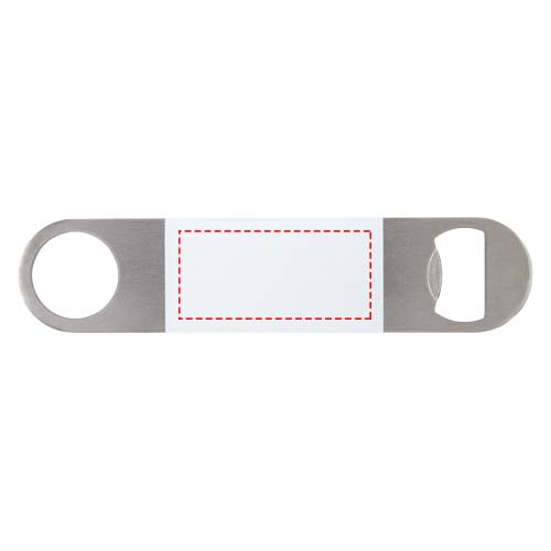 Ruostumattomasta teräksestä valmistettu pullonavaaja, jonka keskellä on suuri värillinen alue.