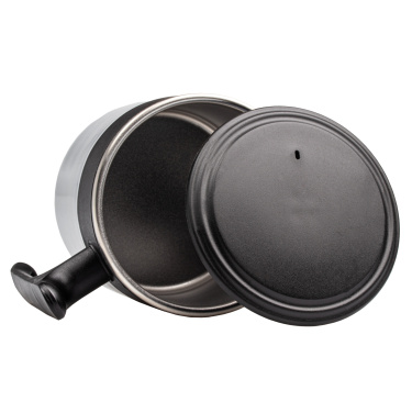 Ruostumattomasta teräksestä valmistettu kaksiseinäinen juomakuppi, jossa on liukumaton pohja, kahva ja täyttötilavuus 300 ml. Logosi painetaan mukiin.
