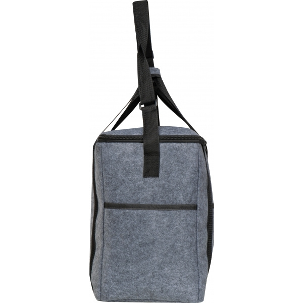 Erittäin suuri kierrätyshuovasta valmistettu kylmälaukku. Siinä on suuri päälokero, kolme ulkoista taskua, kaksi kantokahvaa ja säädettävä olkahihna.