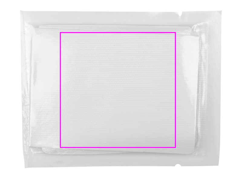 Pienikokoiseen pakkaukseen (8,5 x 6 cm) taitettu sadeponcho. Painamme logosi pakkaukseen kiinnitettyyn tarraan. Taitettavan takin selkä - 113 x 78 cm.