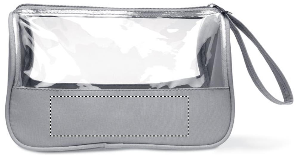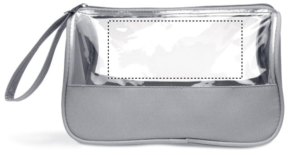 Toilettilaukku mikrokuitua ja PVC- muovia, sisältää ranne hihnan. Ftalaatti vapaa.