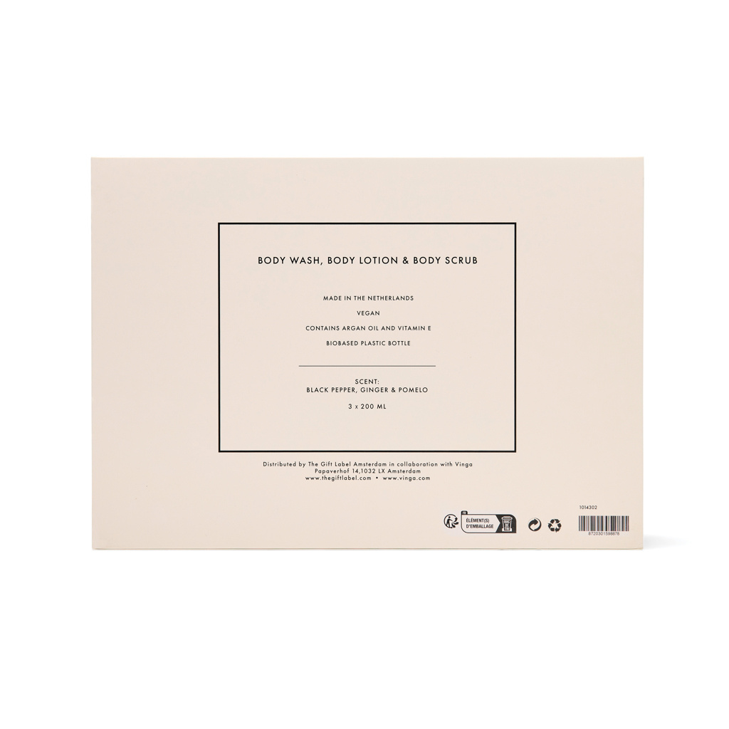 Muuta jokainen suihku tai kylpy ylelliseksi rituaaliksi. Tämä 3-osainen setti sisältää 200 ml tuubit vartalopesua, vartalokuorintaa ja vartalovoidetta, jotka ravitsevat ihoa päästä varpaisiin. Lämmin ja raikas mustapippurin, inkiväärin ja pomelon tuoksu jättää ihon pehmeäksi, raikkaaksi ja kevyesti tuoksuvaksi. Tyylikkäästi pakattu kermanvalkoiseen ja mustaan lahjarasiaan.