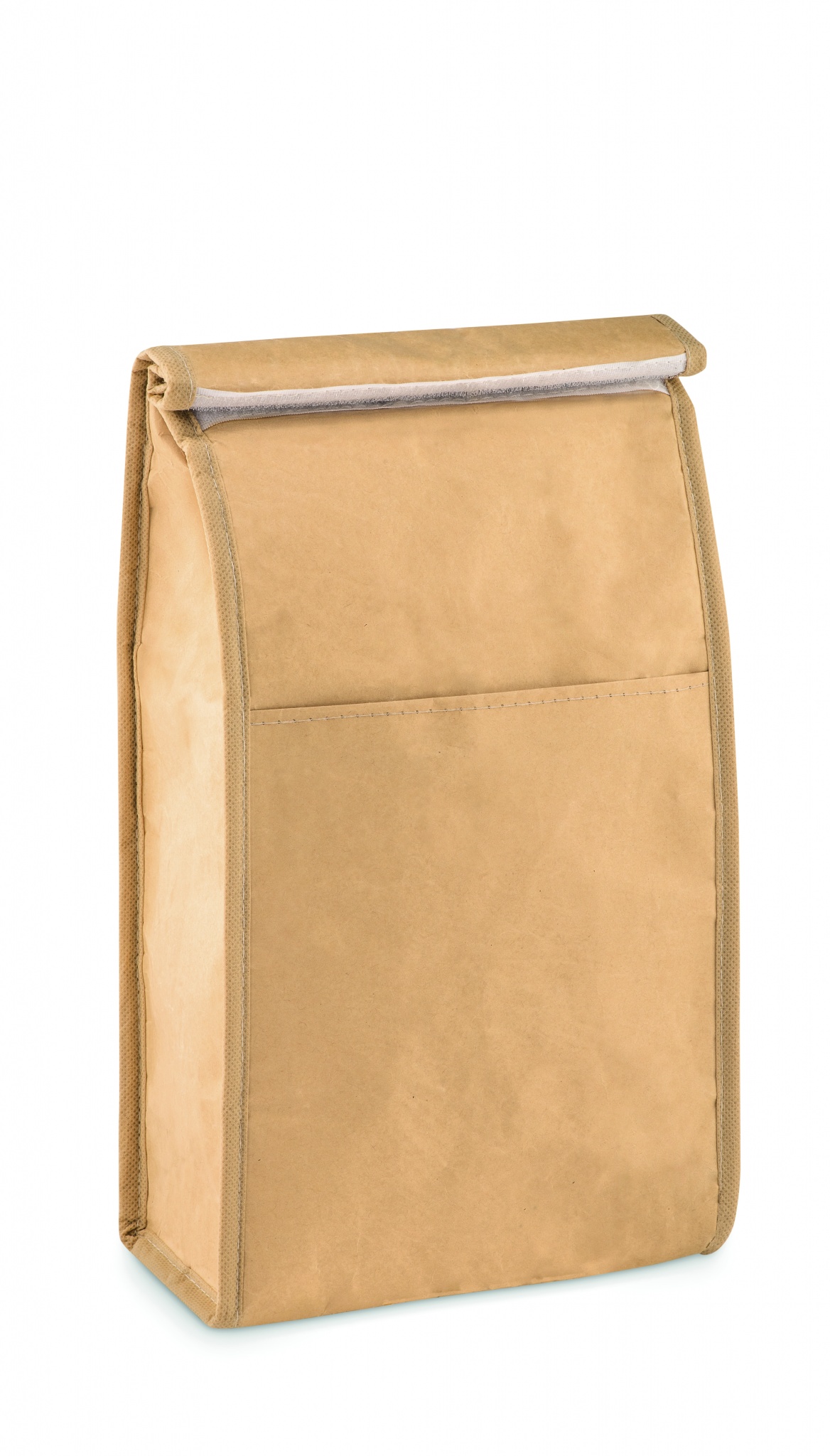Popieriaus austas šaltkrepšys su priekine kišene. Izoliacinė medžiaga: PE putų sluoksnis. Talpa 3L.