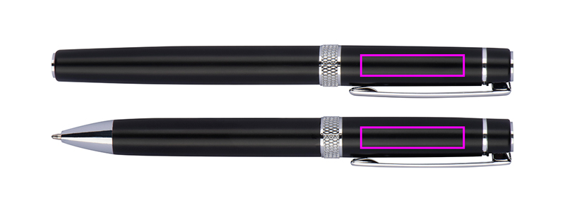 Rašymo rinkinys, kurį sudaro sukamas tušinukas su mėlynos spalvos rašymo sistemos užpildu ir mėlynas rašomasis ritininis rutulys iš aliuminio dėkle. Chromuotos aplikacijos ir blizgantys dekoratyviniai žiedai suteikia rinkiniui elegantišką išvaizdą. Jūsų logotipas bus išgraviruotas ant abiejų rašiklių, esančių klipo dešinėje.