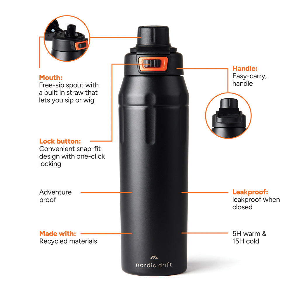 Sukurtas ilgam laikui, skirtas tyrinėti. Susipažinkite su „Nordic Drift“ perdirbto plieno buteliu, pagamintu iš 79 % RCS sertifikuoto perdirbto nerūdijančio plieno. Sukurtas nuotykiams, 750 ml talpos, jis pasižymi patvariu milteliniu būdu dažytu korpusu, nešiojimo rankena ir užrakinamu dangteliu, kad jūsų gėrimas būtų saugus. Novatoriškas dangtelis siūlo dvi gėrimo parinktis: tiesiog pasukite nuo snapelio iki gurkšnojimo funkcijos, kad lengvai atsigertumėte kelyje. Šis butelis yra nepralaidus ir sukurtas tiek nuotykiams lauke, tiek kasdieniam naudojimui, todėl derinamas praktiškumas ir tvarumas. Pristatoma su FSC dovanų dėkute. Visi „Nordic Drift“ produktai yra patikrinti dėl kokybės. Kadangi mes tvirtai pasitikime savo įrangos našumu ir patvarumu, kiekvienam gaminiui suteikiama 5 metų garantija nuo gamybos defektų.