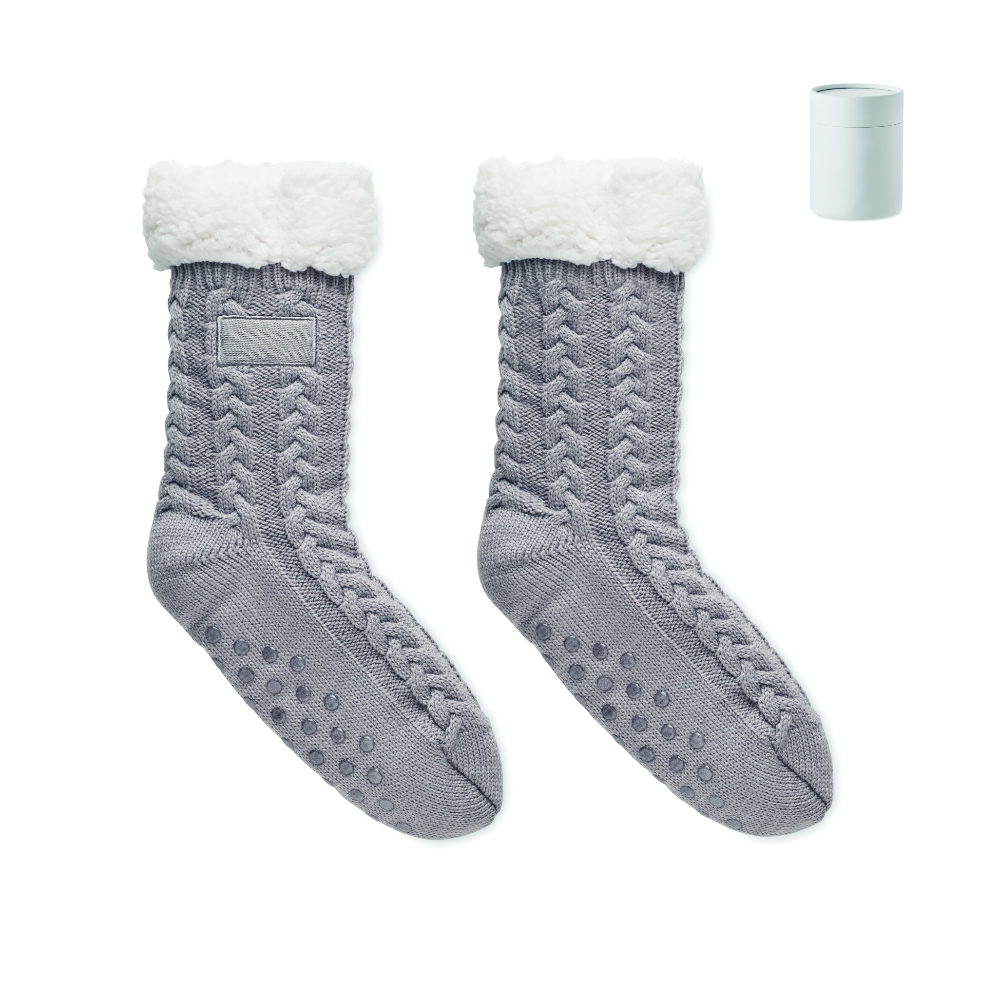 Kabeliu megztų šlepečių kojinių pora su neslystančiais griebtuvais apačioje iš akrilo špagato ir 240 gr/m² dirbtinio šerpo pamušalo. Pateikta dovanų dėžutėje. Dydis M= 36-39.