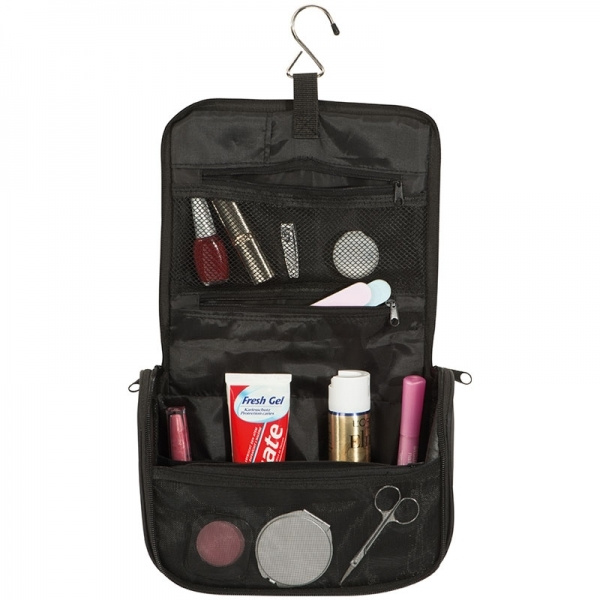 190T nailono tualeto krepšys su dideliu vidiniu skyriumi, 3 skyreliais su užtrauktuku, 4 elastinėmis juostomis ir kabliuku. Priekyje atspausdiname Jūsų logotipą.