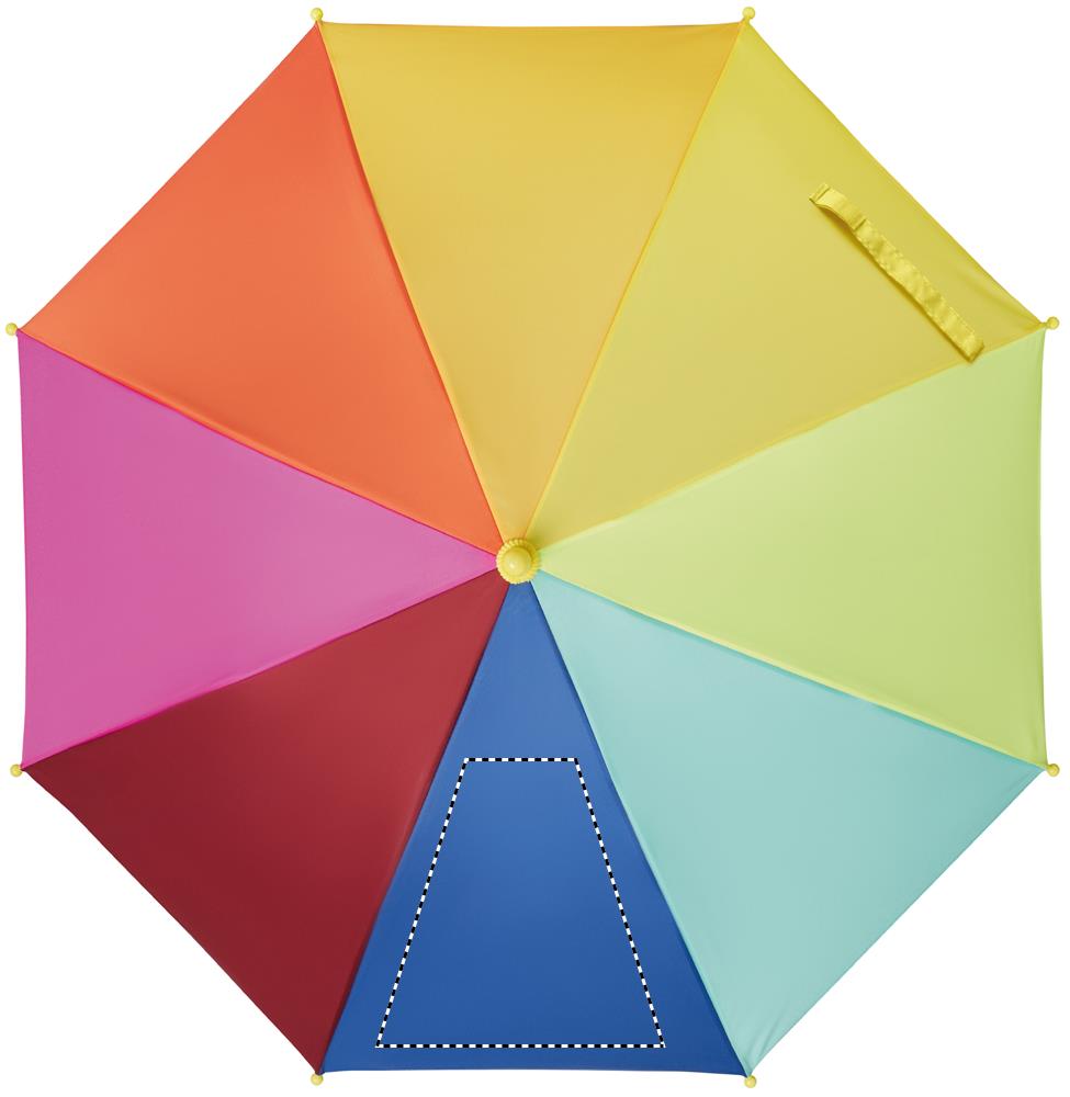 18 collu bērnu lietussargs 190T pongee ar varavīksnes rakstu. Tam ir 8 paneļi. Manuāla atvēršana un aizvēršana. Stikla šķiedras ribas un rāmis. Plastmasas rokturis un uzgaļi. Izliekts rokturis.