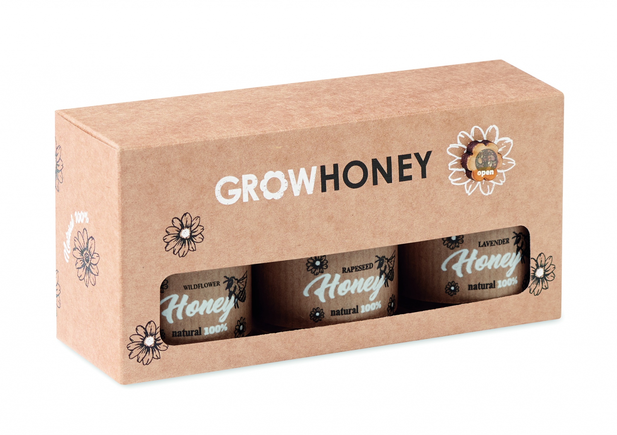 Izlase no 3 dabīgā medus burciņām ar koka medus kausu. Savvaļas ziedu, lavandas un rapšu medus (katrs 50g). Tiek piegādāts kraftpapīra kastē. Tostarp medus bišu ziedu sēklas. Ražots ES. Nav pieejams pārdošanai Apvienotajā Karalistē.