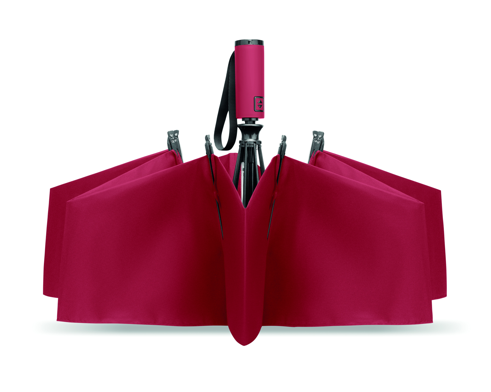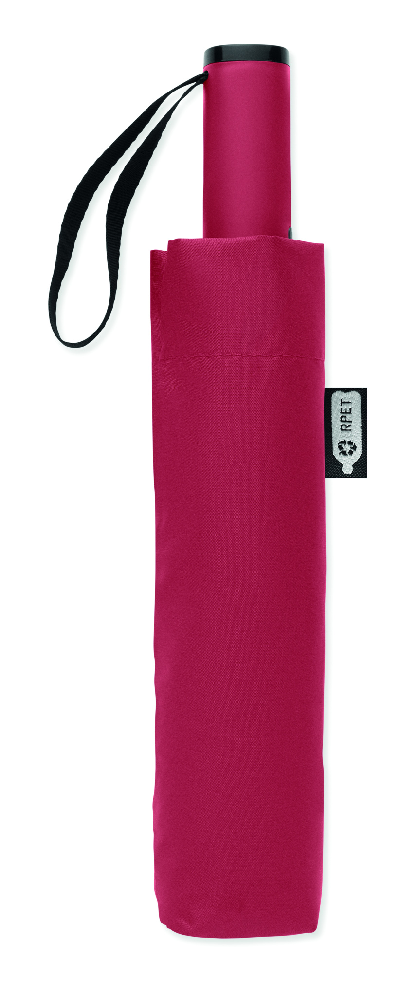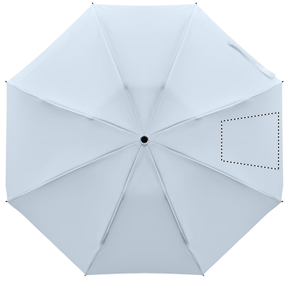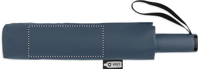 23-inch 3-fold reverse windproof umbrella made of 190T RPET pongee and matching pouch. Auto open and close, full black plating frame, fibreglass ribs, and a rubber-finished ABS handle.