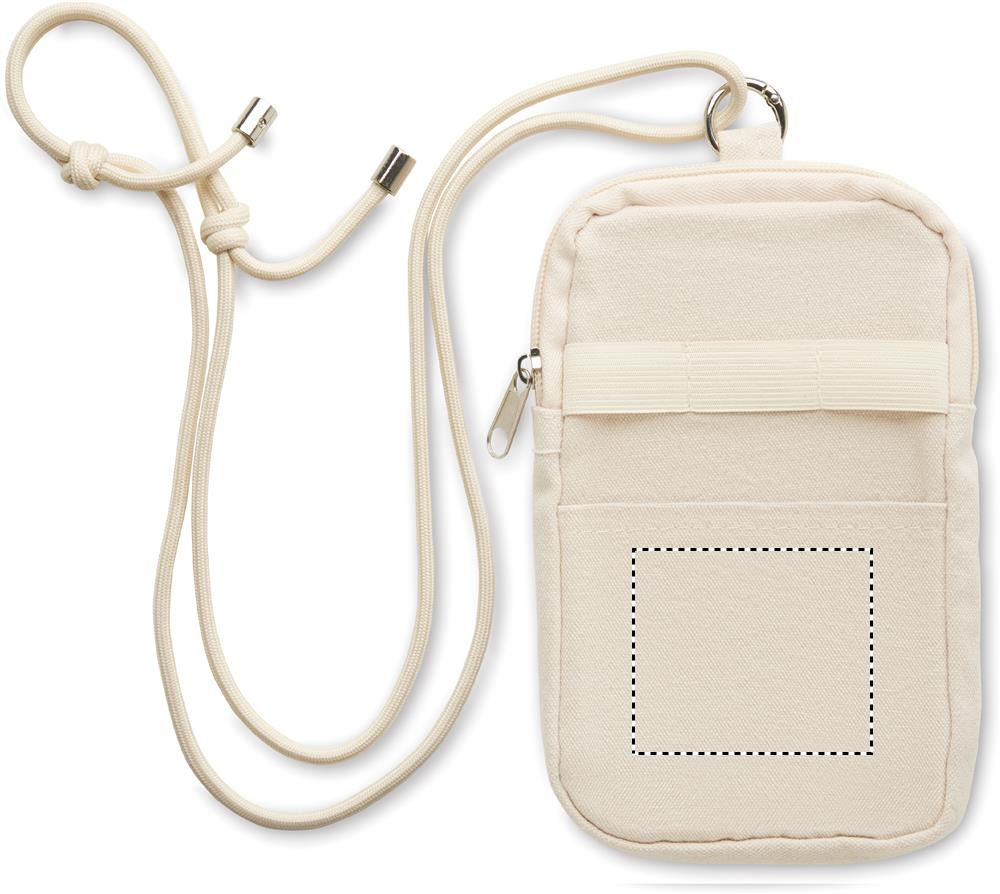 Cross body smartphone bag in recycled cotton with RPET polyester adjustable lanyard with open pocket on front side. 280 gr/m².