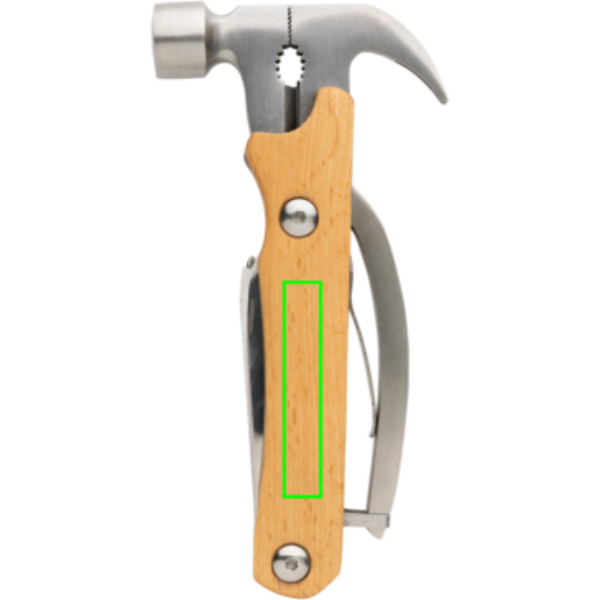 Многофункциональный инструмент Hammer, изготовленный из 100% древесины бука FSC, нержавеющей стали высокой твердости и коррозионностойкой стали (420). Твердость по Роквеллу 42-52. Изделие имеет 10 функций: плоскогубцы, гвоздодер, коготь, молоток, кусачки, напильник, плоская отвертка, открывалка для бутылок, крестовая отвертка, пила, нож. Лезвие безопасно для пищевых продуктов. Упаковано в коробку FSC mix kraft.