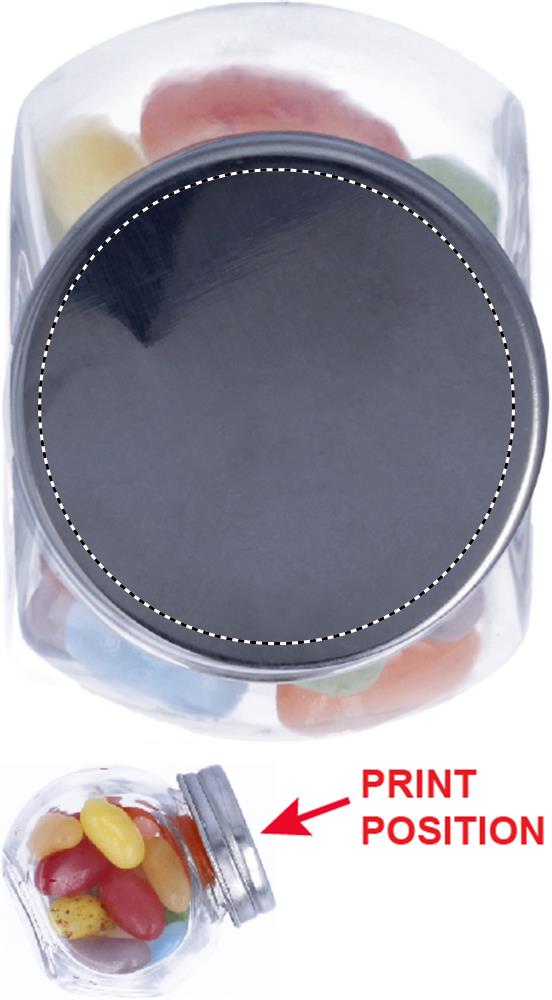 Разноцветные леденцы в стеклянной банке с металлической крышкой.