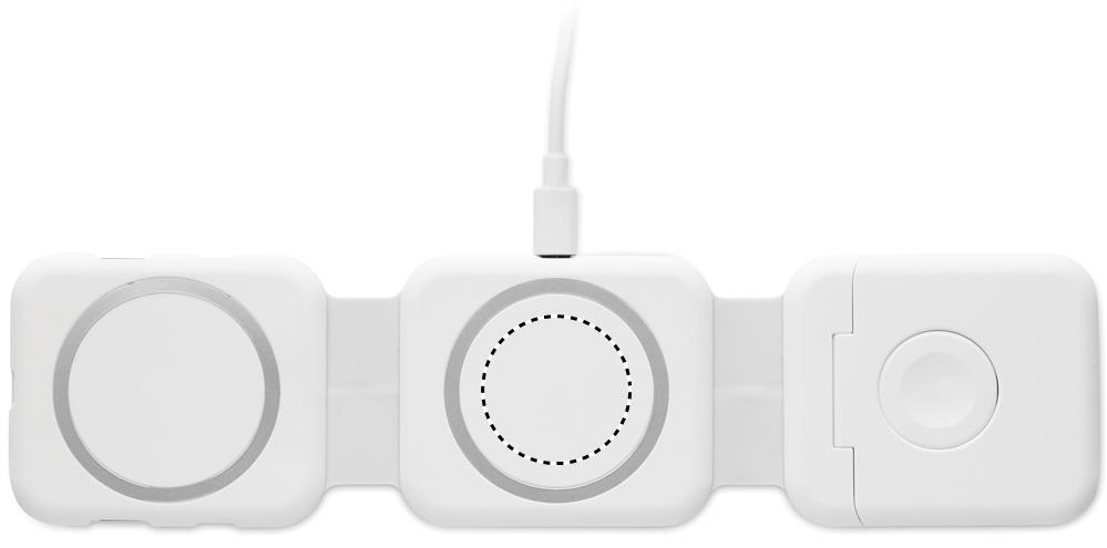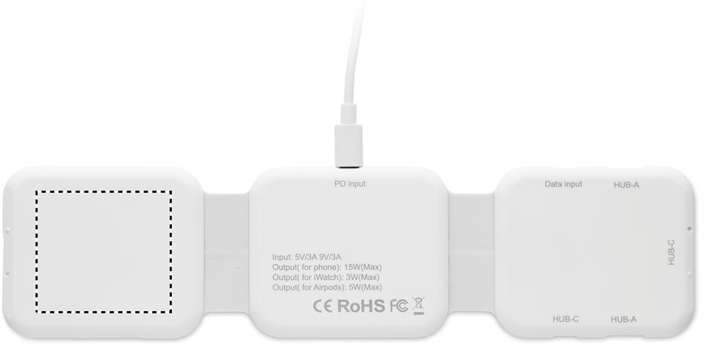 Magnetic charging station in ABS. 3 wireless charging spots. 1 x 15W, 1 x 5W for TWS and 1 Apple Watch charger (3W). 2 Type-C & 2 USB-A HUBS. Integrated cable input: connector from Type-C to USB-A.