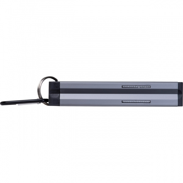 Мини-уровень из алюминия с вставками из АБС-пластика, двумя пузырьковыми уровнями, магнитом снизу и карабином. Ваш логотип наносится на уровень лазерной гравировкой.