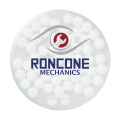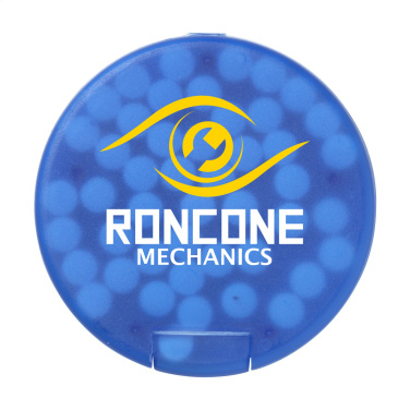 Круглый пластиковый диспенсер, наполненный примерно 12 г (55 штук) мятных леденцов без сахара.